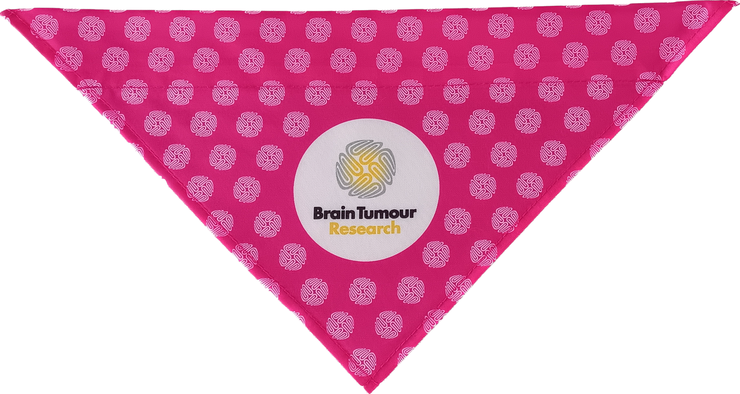 Magenta coloured pet bandana with Brain Tumour Research branding