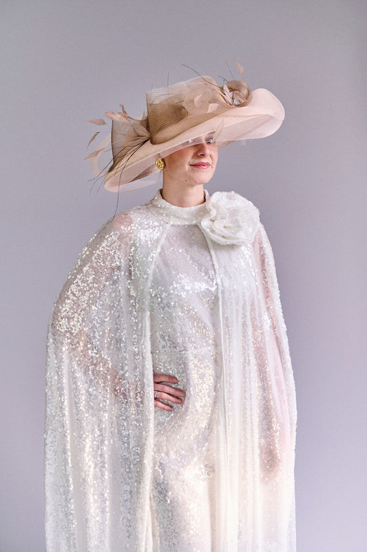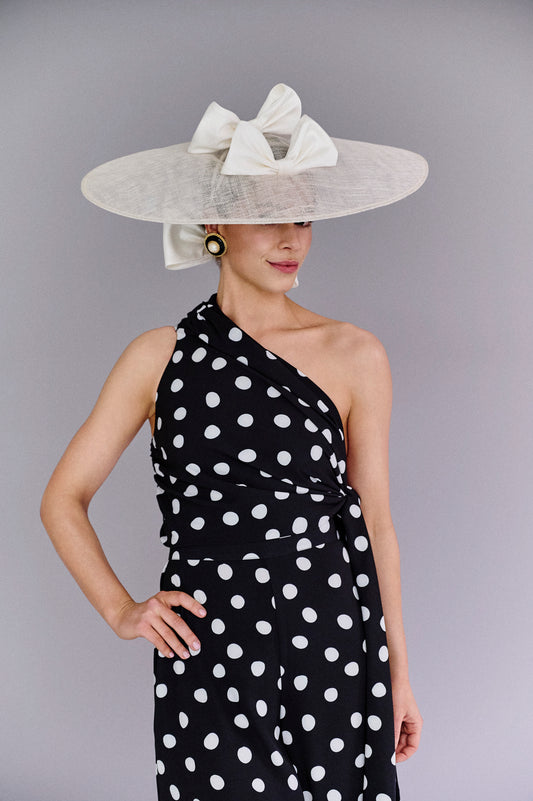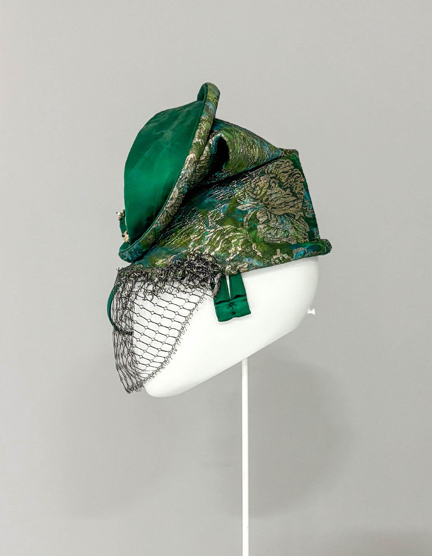 Inspired by the winning stallion Royal Palace, this hat takes cues from the Green Room of Buckingham Palace. Green and gold silk mirror the luxurious upholstery and ornate décor fit for royalty.